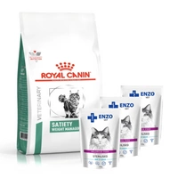 ROYAL CANIN Saturs Svara zudums SAT 34 6kg + ENZO VET Sterilizēts ar teļa gaļu mērcē 3x100g